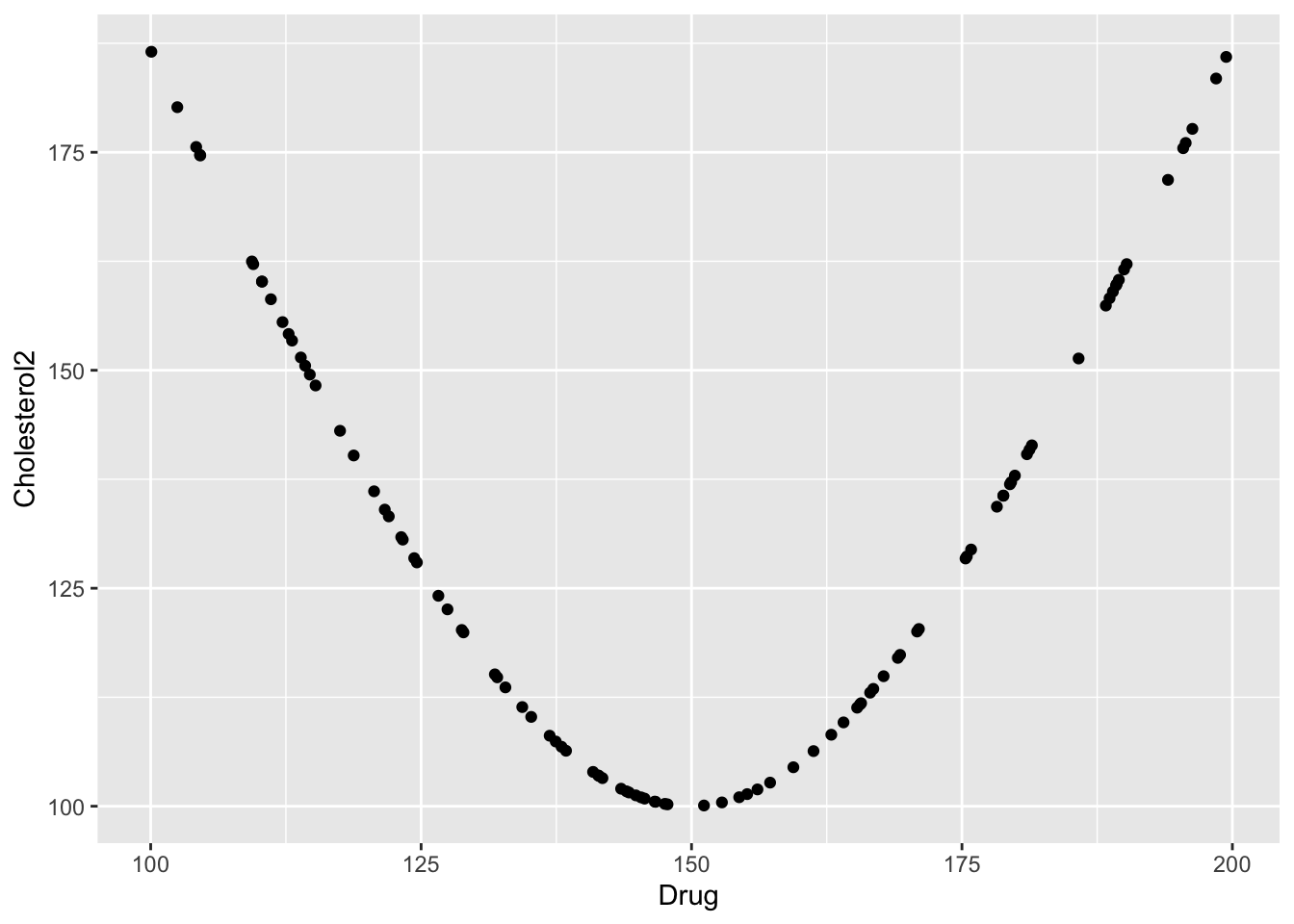 We’ll start with the same data as before, but now mess around with it. Specifically, I’m creating a new variable called Drug and a new cholesterol variable that depends on drug concentration in a nonlinear manner.