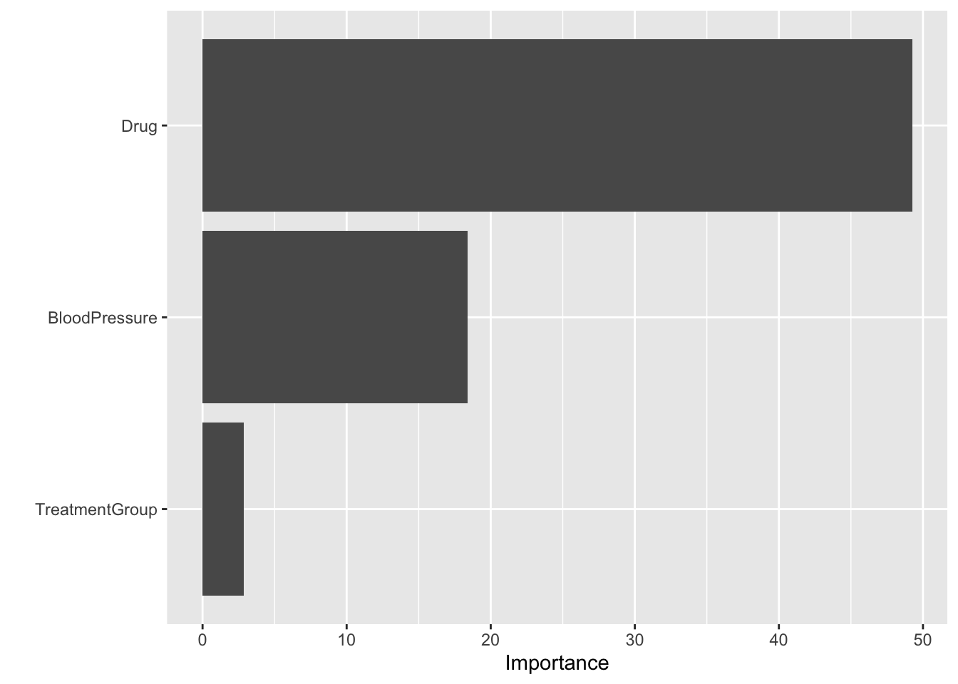 It is always possible to try a more complex model to see if there might be patterns that a linear or other simple model can’t detect. Here, we are trying a random forest model, which can detect more complicated correlations between predictor variables and output. Random forest models don’t produce the standard p-values, but one can look at something called variable importance to see which variables most impact the outcome. And we see that it correctly identifies drug as the most important variable. The other two should really be at zero importance, since they are not correlated with the outcome. But this model is flexible enough to fit to possibly spurious patterns.